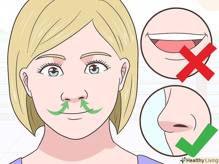 Почніть дихати носом, якщо помітите, що дихаєте ротом.якщо дихання ротом не викликано структурною аномалією в ротовій порожнині, значить, це звичка. Щоб позбутися від неї, необхідно її розпізнати і тут же виправити. Почніть дихати носом відразу після того, як помітите, що дихаєте ротом.[6]