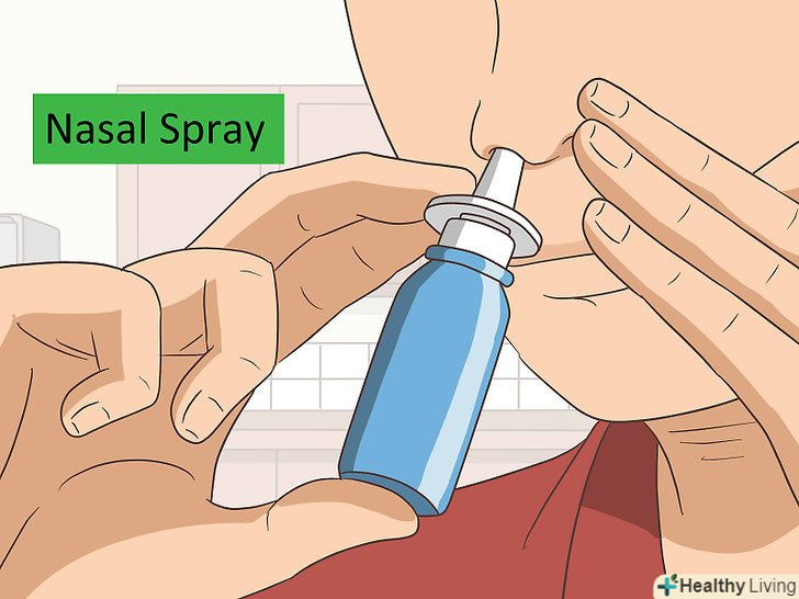 Використовуйте спрей для носа, щоб усунути непрохідність носових шляхів.якщо причина закладеності криється в алергії або застуді, безрецептурні Спреї для носа допоможуть прочистити пазухи, щоб ви могли спокійно дихати носом. Купіть спрей в аптеці і прочитайте інструкцію перед тим, як його використовувати. Спочатку продуйте ніс, щоб прочистити його, а потім обережно вставте носик по черзі в кожну ніздрю і натисніть на аплікатор, щоб розпорошити ліки в ніс.[8]