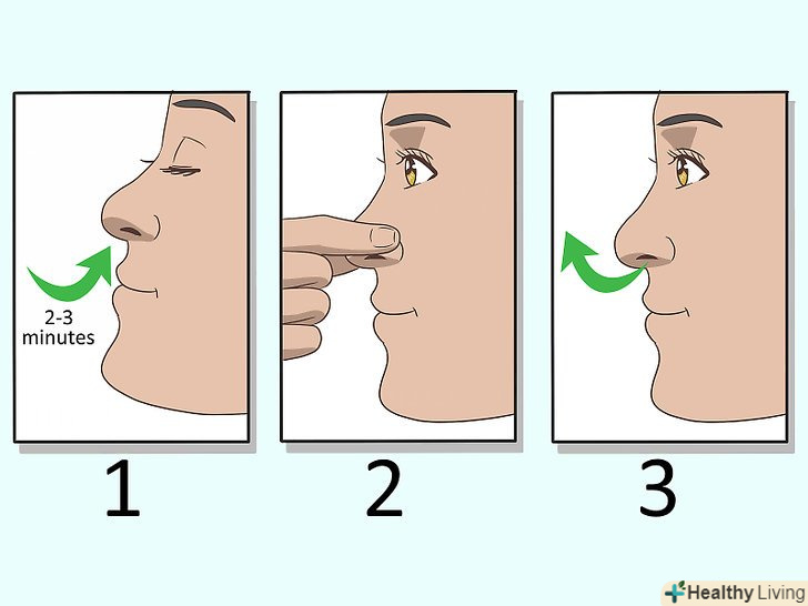 Виконуйте вправи з очищення носа.дихайте носом протягом 2-3 хвилин, а потім закрийте рот, глибоко вдихніть і закрийте ніс пальцями. Коли ви більше не зможете затримувати дихання, почніть повільно видихати через ніс. Продовжуйте робити так, поки не прочистіть ніс.[11]