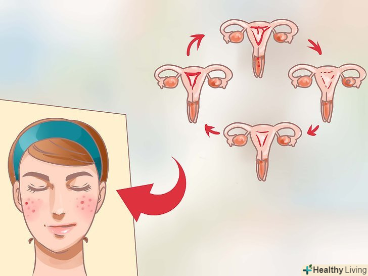 Знайте, що викликає гормональне акне.у багатьох підлітків і дорослих жінок вугровий висип посилюється перед початком менструації, найчастіше за 10 днів. Якщо вугровий висип посилюється в залежності від часу циклу, вона вважається гормональною.[16]- У першій половині менструального циклу основним репродуктивним гормоном є естроген, а в другій – прогестерон (цей гормон стимулює вироблення шкірного жиру). Крім того, відносний рівень тестостерону збільшується, що також стимулює вироблення шкірного сала.