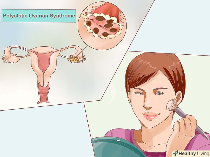 Знайте причини гормонального акне.причини вугрової висипки не завжди очевидні. Висипання можуть викликати певні проблеми зі здоров'ям-наприклад, синдром полікістозних яєчників. Висип також може з'являтися як реакція на хімічні речовини в косметиці або інших засобах догляду, на куріння, на молочні продукти, а також на продукти з великим вмістом хімічних речовин і цукру. Крім того, висип може вказувати на запальний процес або бактеріальну інфекцію в організмі.[19]- Високий вміст тестостерону в крові або його підвищена активність також може провокувати акне. Це можливо в другій половині менструального циклу. Проблема може бути не те, що тестостерону занадто багато, а в тому, що його багато щодо естрогену і прогестерону.