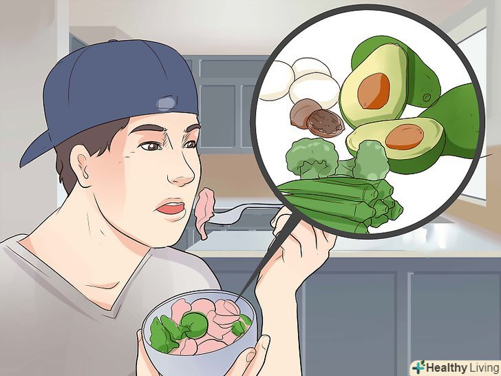 Вживайте нежирну їжу.як правило, червоне м'ясо містить велику кількість жиру. Замініть яловичину і свинину м'ясом птиці і рибою. З'їдайте не більше 170 грамів м'яса в день.[29][30]- Обрізайте з м'яса жирні ділянки і видаляйте шкіру.