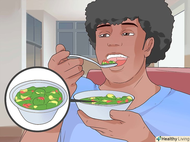 Втамовуйте відчуття голоду овочами і фруктами.у фруктах і овочах міститься мало жирів і велика кількість харчових волокон і вітамінів. Для підтримки здоров'я серця слід з'їдати по 2-3 склянки фруктів і таку ж кількість овочів щодня.[27][28]- Як правило, свіжі або заморожені овочі корисніше консервованих. Уникайте овочів, консервованих з додаванням солі, і фруктів, консервованих в цукровому сиропі. Не їжте смажені, паніровані або приготовані в жирному соусі овочі.