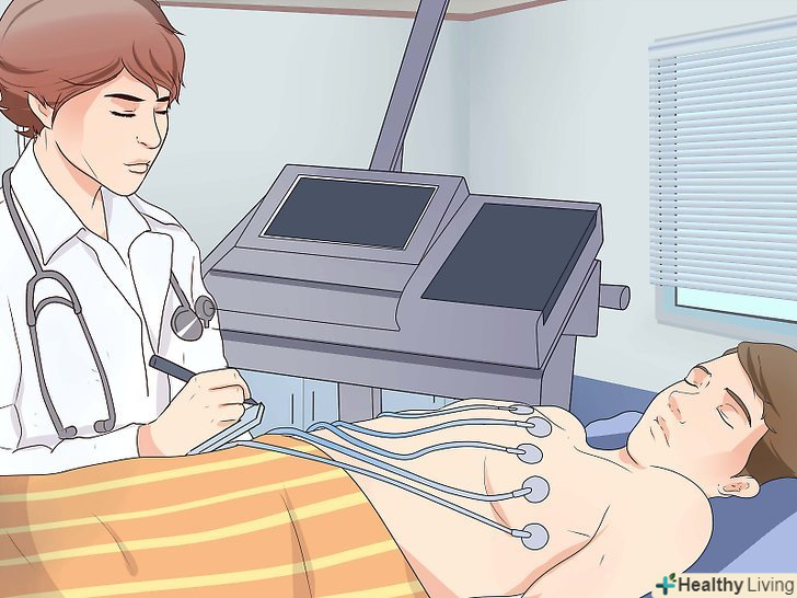 За призначенням лікаря пройдіть додаткові дослідження. виходячи з конкретних симптомів та історії хвороби, лікар може призначити наступні дослідження:[14][15]- Електрокардіографія (ЕКГ). При цьому дослідженні до ваших рук, ніг і грудей прикріплюються металеві електроди. Електроди приєднані до апарату, що вимірює електричні імпульси серця. Це неінвазивна і безболісна процедура.