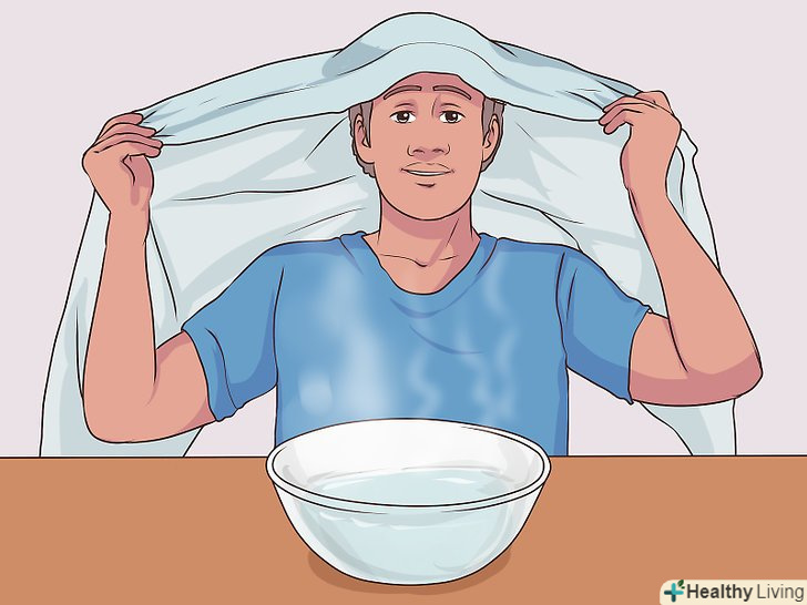 Візьміть рушник і накиньте його собі на голову і плечі.Сядьте на стілець і нахиліться над мискою на достатній відстані від пари. Накрийте голову, плечі і миску рушником.[12]- Так пару буде нікуди піти, а вам буде простіше їм дихати.