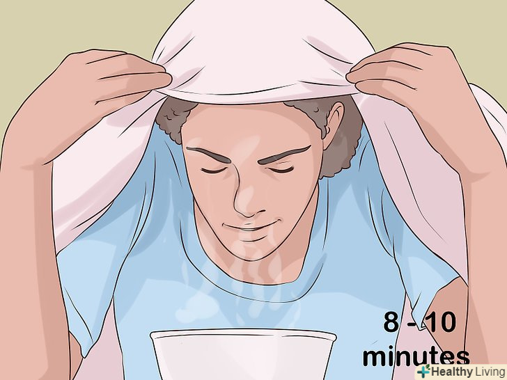 Вдихайте пар протягом 8-10 хвилин. Цього має бути достатньо. Встановіть таймер, щоб стежити за часом. Коли закінчите, постарайтеся протягом 30 хвилин не розмовляти. Так ваші голосові зв'язки зможуть відпочити і відновитися після процедури.[13]