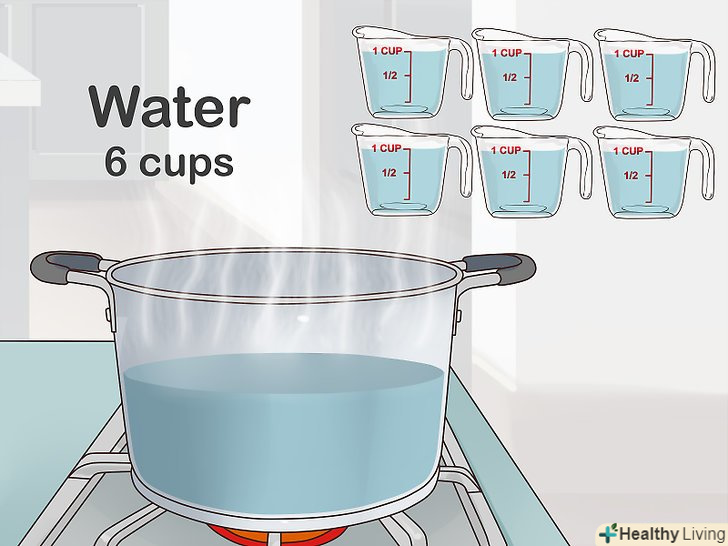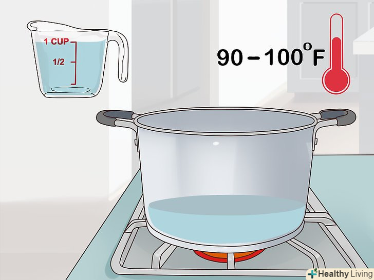 Нагрійте 6 склянок води (близько півтора літрів).вилийте в каструлю 6 склянок води. Поставте каструлю на плиту на середній вогонь. Коли вода почне випаровуватися (приблизно через 8-10 хвилин), вимкніть вогонь і зніміть каструлю з плити.[10]- При 65 °C вода буде давати достатньо пари.