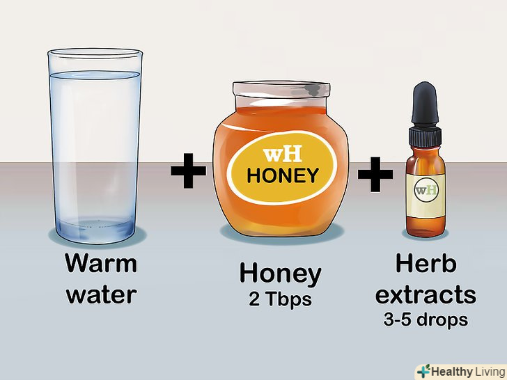 Додайте 30 мл меду.додайте в теплу воду трохи меду і перемішайте, поки мед повністю не розчиниться. За порадою лікаря в цей розчин також можна додати екстракт якихось лікувальних трав. Додайте у воду три-чотири краплі екстракту.[8]- До натуральних засобів, які допомагають вгамувати біль в горлі і відновити голосові зв'язки, відносяться кайенский перець, солодка (лакриця), алтей лікарський, прополіс, шавлія, іржавий в'яз і куркума.
