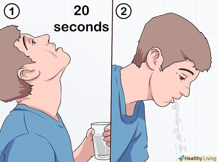 Прополощіть горло протягом 20 секунд.зробіть ковток розчину і закиньте голову. Нехай рідина проникне якомога глибше в горло, але не ковтайте її. Повільно видувайте повітря з горла, щоб прополоскати його (простіше кажучи, «побулькайте»). Коли закінчите Полоскати горло, не забудьте виплюнути рідину.[9]- При кожній процедурі горло слід полоскати тричі. Полощіть горло кожні 2-3 години протягом усього дня.