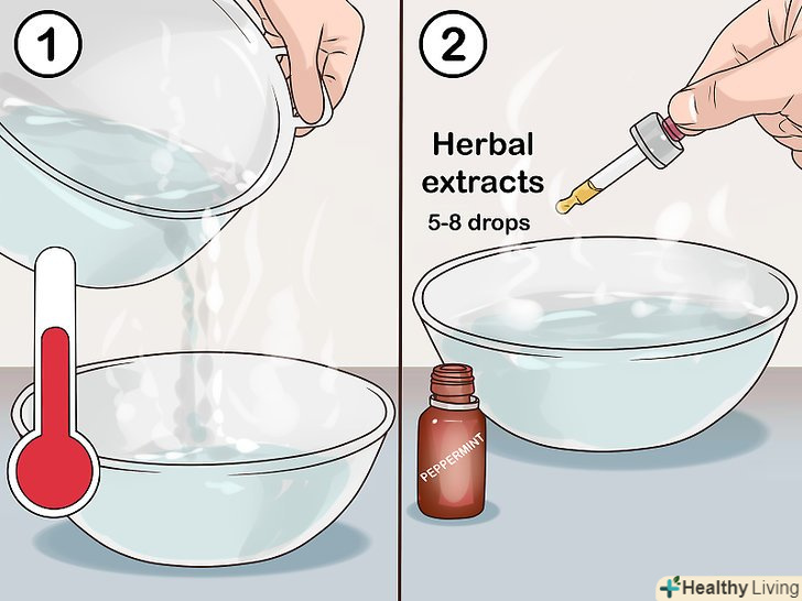 Вилийте гарячу воду в миску.поставте миску на стіл і вилийте в неї воду. При бажанні в воду можна додати екстракти трав. Додайте у воду п'ять-вісім крапель обраного екстракту.[11]- Для більшої користі додайте в воду екстракт ромашки, чебрецю (чебрецю), лимона, материнки або гвоздики.