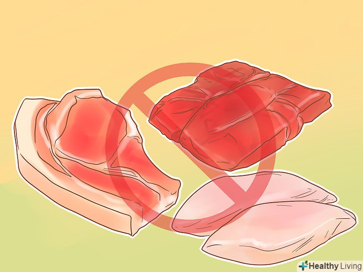 Уникайте дієти з високим вмістом білка.збільшення м'язової маси також може привести до підвищення рівня КФК в крові. Оскільки є дієти з високим вмістом білка, які можуть сприяти збільшенню м'язової маси, цього слід уникати. Проте, не виключайте повністю весь білок зі свого раціону. Усунення всіх джерел білка в раціоні може викликати атрофію м'язів, так як тіло буде намагатися отримати необхідний білок з ваших м'язів. М'язове виснаження тягне за собою руйнування м'язів і, таким чином, підняття рівня КФК.[7]- Багаті білком продукти: яловичина, свинина, курка, індичка і риба, сир, яйця, тофу, бобові, молоко, йогурт, горіхи і насіння.