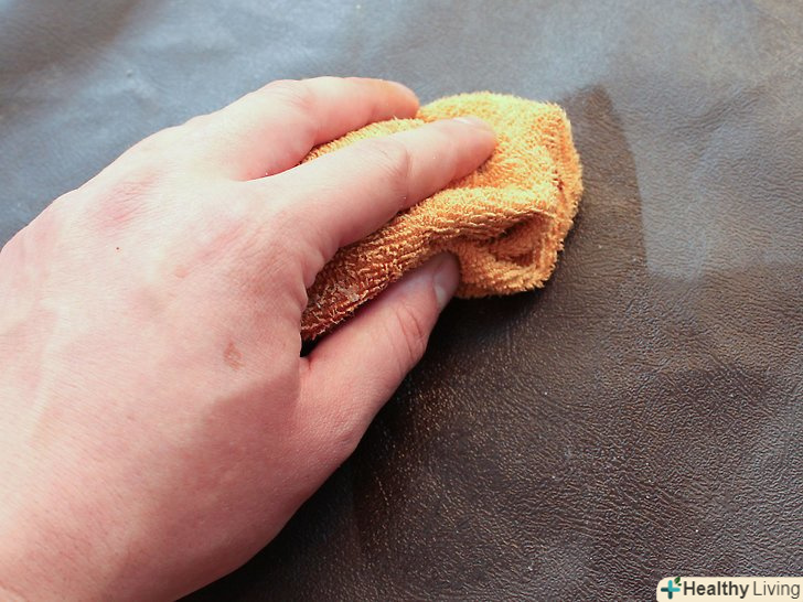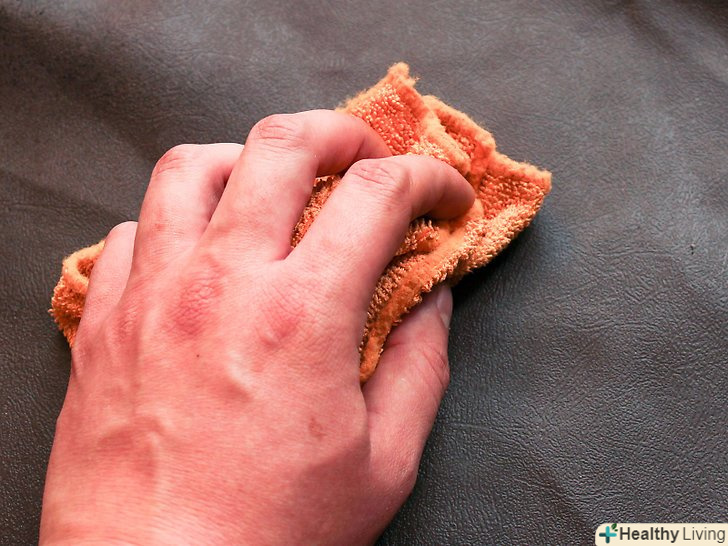 Очистіть забруднене місце.нанесіть знежирюючий розчин на рушник або ганчірку з мікроволокна і як слід потріть пляму. Якщо ви помітите, що колір шкіри передається ганчірці, негайно зупиніться і почекайте, поки забруднене місце висохне, перш ніж продовжити далі.[12]