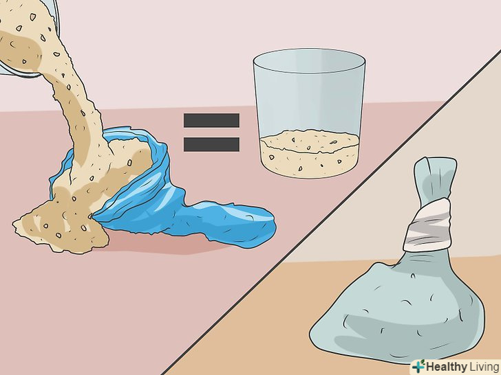 Приготуйте мішечок з вівсянкою. висипте вівсяні пластівці в нейлоновий панчіх або тканину з мусліну. Для приготування ванни дитині вам знадобиться близько 80 грам вівсянки. Зауважте на тканини вузол, щоб вівсянка не висипалася. Найголовнішим тут є вибір тканини. Вона повинна пропускати воду, але не випускати вівсянку назовні.