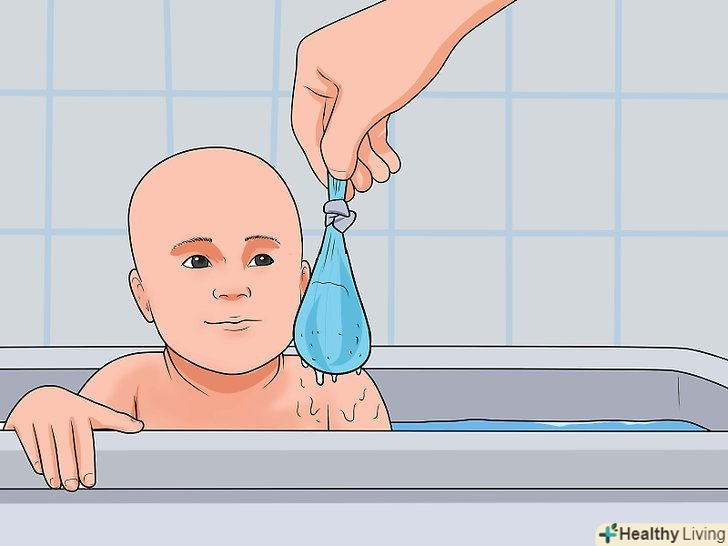 Акуратно викупайте свою дитину. викупайте дитину в вівсяній ванні протягом 15-20 хвилин. Дістаньте мішечок з ванни, піднесіть його до дитини і дозвольте молочній воді з мішечка покапать на шкіру дитини. [6]