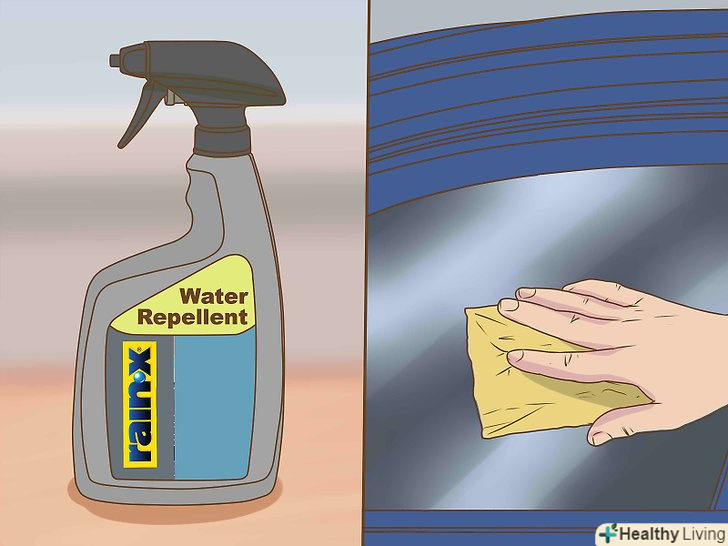 Нанесіть на скла водовідштовхувальний засіб. обробіть скла водовідштовхувальним засобом, щоб там не збиралася вода і вам було краще видно дорогу. Наносити цей засіб можна тільки на чисте і сухе скло. Якщо вода перестане збиратися в крапельки, нанесіть засіб повторно. Обробляйте бічні і заднє скла раз в кілька місяців, а лобове — в середньому раз на місяць, оскільки там водовідштовхувальне покриття потрібно найбільше і там його швидше перуть щітки.- Спеціальний засіб для скла може очистити скла краще, ніж звичайний автошампунь, проте скла в будь-якому випадку потрібно ретельно протирати рушниками з мікрофібри. Очищайте скла як зовні, так і всередині.