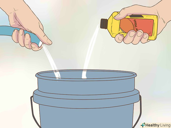 Наповніть відро водою.налийте в воду вказане виробником кількість миючого засобу. Це відро буде використовуватися для миття. Якщо машина дуже брудна або вам потрібно окреме відро для корпусу машини і окреме відро для коліс, Наповніть водою два відра.[3]