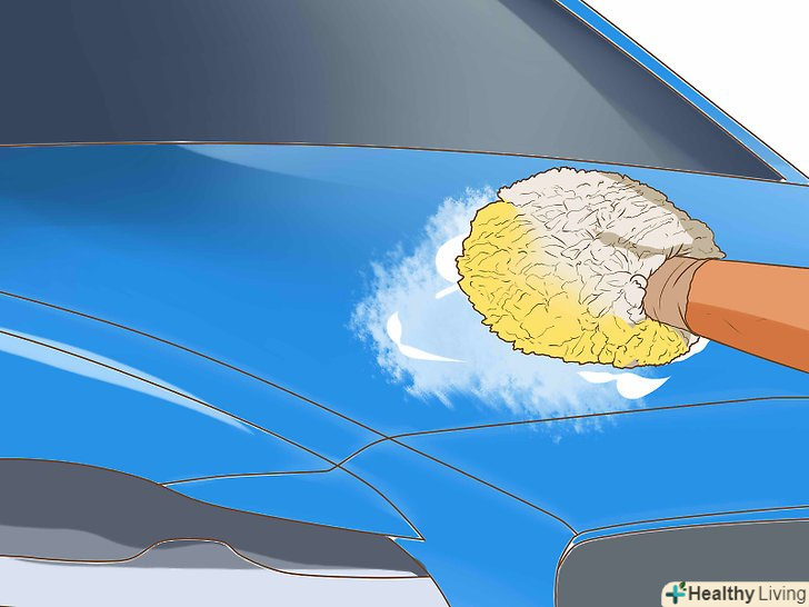 Помийте машину великою рукавицею для прибирання.перш ніж приступити до миття, намочіть велику рукавицю в мильній воді, щоб змити будь-який бруд, яка могла на неї потрапити.[7] не тріть корпус машини щіткою, щоб не залишити подряпини.- Рукавиці з довгим ворсом, схожим на мотузки, не втирають абразивні частинки в лак. Краще використовувати такі рукавиці, оскільки вони не будуть дряпати поверхню. Рукавицю потрібно буде регулярно промивати і заново опускати в мильну воду.