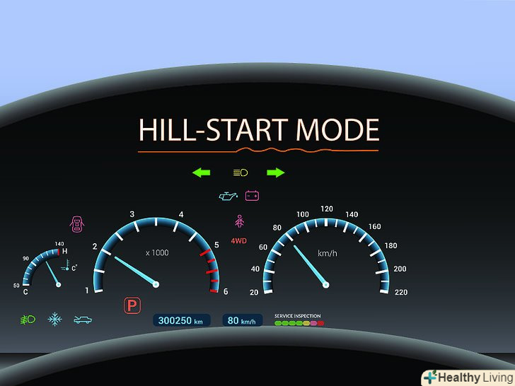 Використовуйте систему допомоги при підйомі в гору( hill start assist), якщо вона у вас є.у багатьох машинах з ручною коробкою передач є така система-вона не дає машині відкотитися назад, коли машина зупиняється на схилі. З цією системою Вам буде простіше рушити після повної зупинки. Якщо у вашій машині є ця функція, вона буде включатися автоматично, і вам не доведеться натискати кнопки.[2]- Сенсори положення машини в просторі визначають, коли машина стоїть під ухилом. Система допомоги буде підтримувати потрібний тиск на гальмо певний час, що дозволить вам прибрати ногу з гальма і перемістити на педаль газу.