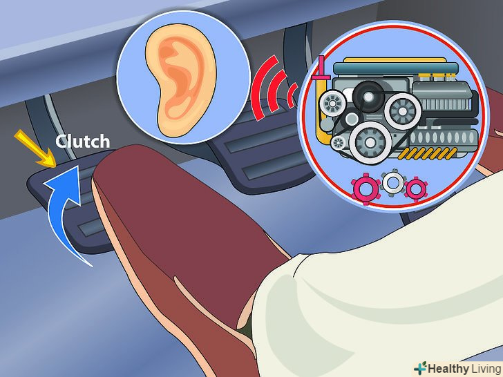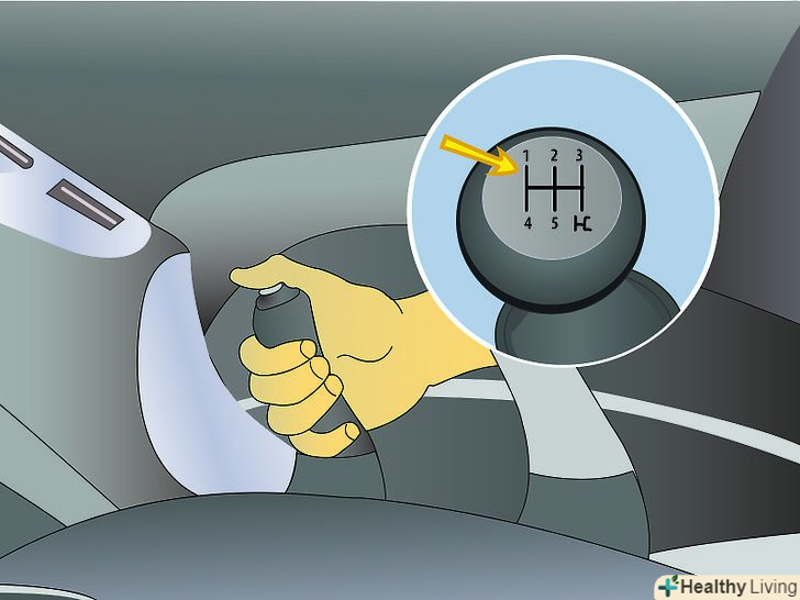 Увімкніть першу передачу .коли Вам потрібно буде знову почати рух, включіть першу передачу і поставте ногу на педаль газу. Поки не відпускайте ручне гальмо.- Тисніть на газ до тих пір, поки двигун не розкрутиться до 3000 оборотів.