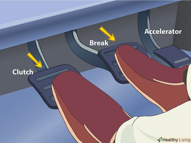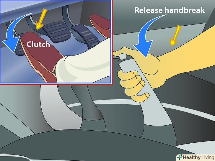 Якщо ручне гальмо не працює, використовуйте педаль гальма.спробуйте п'ятою утримувати педаль гальма, а пальцями тиснути на газ. Відпускайте педаль гальма разом зі зчепленням.- Якщо ручне гальмо не працює, відвезіть машину в ремонт. Не варто покладатися тільки на педаль гальма — це прискорить знос деталей і буде негативно впливати на двигун.