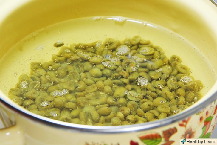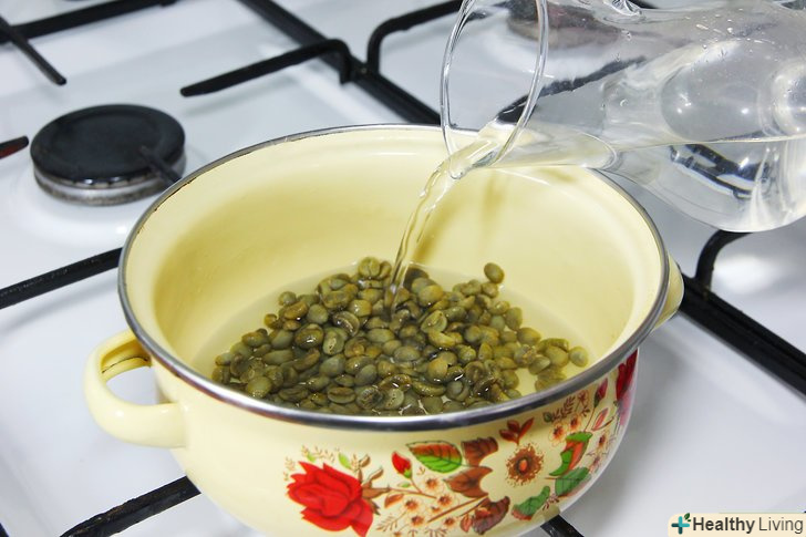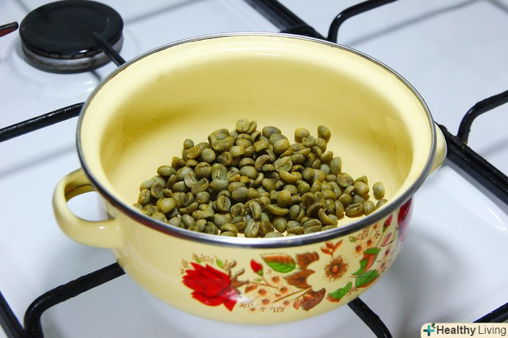 Промийте 1 склянку кавових зерен і висипте в каструлю. висипте 1 склянку (170 г) зелених кавових зерен в дрібне сито і промийте під раковиною. Акуратно промийте зерна, після чого висипте їх в каструлю і поставте на плиту. [2]- Не тріть зерна занадто сильно, інакше зітрете з них паперову лушпиння, в якій містяться антиоксиданти.