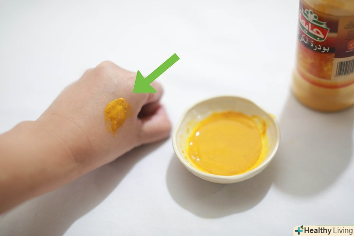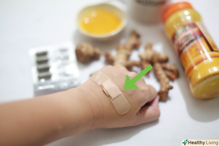 Зробіть пасту з куркуми. при порізах і опіках може бути корисним наносити пасту з куркуми на уражене місце – це, ймовірно, буде одним з кращих методів лікування.- Змішайте воду, порошок куркуми і порошок імбиру. За допомогою стерильного шпателя або щітки нанесіть отриману пасту на уражену область. Ви можете наносити цю пасту і руками, але в такому випадку переконайтеся, що руки чисті. Залиште пасту на ураженій ділянці на кілька годин. [3]