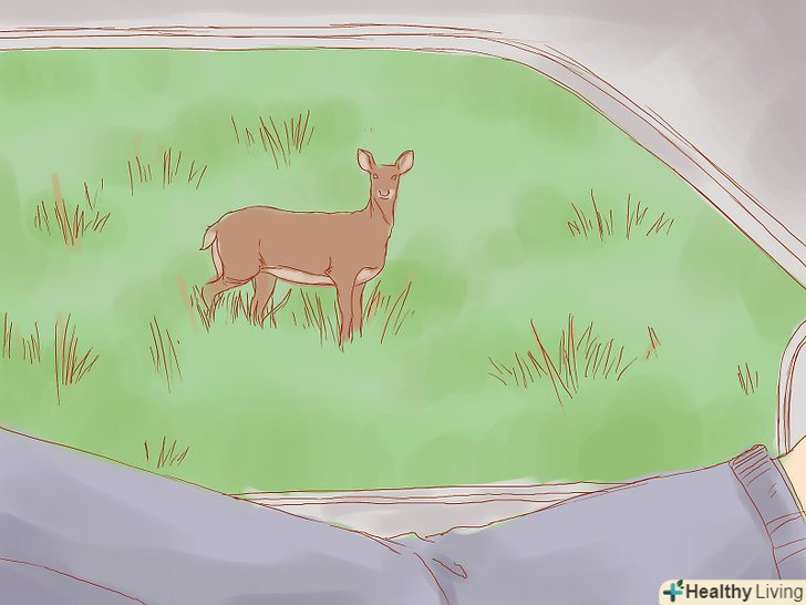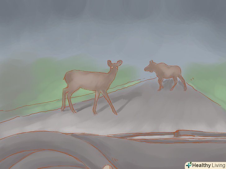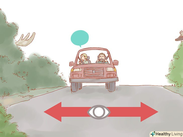 Слідкуйте за околицями.по ходу руху уважно оглядайте узбіччя на предмет появи диких тварин. Якщо ви везете пасажирів, то попросіть їх допомогти, але заздалегідь попередьте, що кричати не варто, тому що від несподіванки ви можете смикнутися і зреагувати неправильно. Нехай Той, хто першим помітить лося або оленя спокійно скаже вам про це. Оглядайте узбіччя і придорожні смуги, заглядайте в канави (в них зручно пастися) і перетинають путівки, не спускайте очей з розділових газонів і зустрічної смуги: стежте за проявом будь-якого руху, темних силуетів або блискучих очей.- Слідкуйте за обома узбіччями: багато водіїв приділяють основну увагу попутному узбіччі і забувають про зустрічну. Небезпека може прийти звідки завгодно, майте це на увазі і поглядайте на обидві сторони дороги!