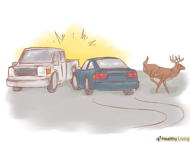 Якщо зіткнення неминуче, то мінімізуйте наслідки.якщо ви бачите, що аварії уникнути неможливо, то постарайтеся звести її наслідки до мінімуму. Ось кілька порад про те, як це зробити.- Постарайтеся направити автомобіль в ту сторону, звідки біжить тварина. Так ви збільшите дистанцію, тому що налякане чотириноге навряд чи змінить напрямок і кинеться назад. Цей трюк навряд чи спрацює при зустрічі з групою тварин або якщо перед вами опинився олень.