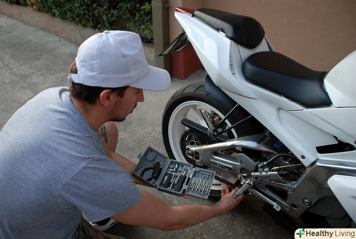 Перевірте байк особисто.прихопіть з собою кілька інструментів, включаючи кишеньковий ліхтарик і, якщо можливо, мультиметр.- Перевірте стан приводного ланцюга і зірочки. Ланцюг повинна мати приблизно 2 см вільного ходу (вгору і вниз), а зуби зірочки не повинні мати явних ознак пошкоджень і зношеності. Постарайтеся покрутити ланцюг на зірочці з боку в бік. Прокрутка на хорошій регулюванні повинна бути відсутнім. Нехай хтось сяде на мотоцикл, щоб ви могли перевірити, чи добре натягнута ланцюг. Ланцюги час від часу зношуються, але зірочки за часом повинні служити набагато довше. Сильно зношена Зірочка може говорити або про те, що вона дуже стара, або технічний зміст не проводилося відповідним чином.