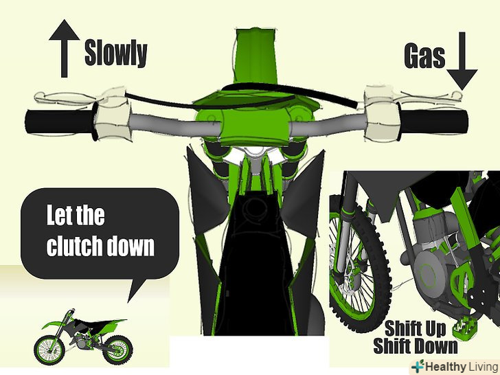 - Після того, як ви завели мотор, затисніть зчеплення і переключіть передачу на першу. Ви зрозумієте, що переключили передачу, тому що мотоцикл сіпнеться вперед. Не відпускайте зчеплення, якщо ви не рухаєтеся, інакше мотоцикл затихне.