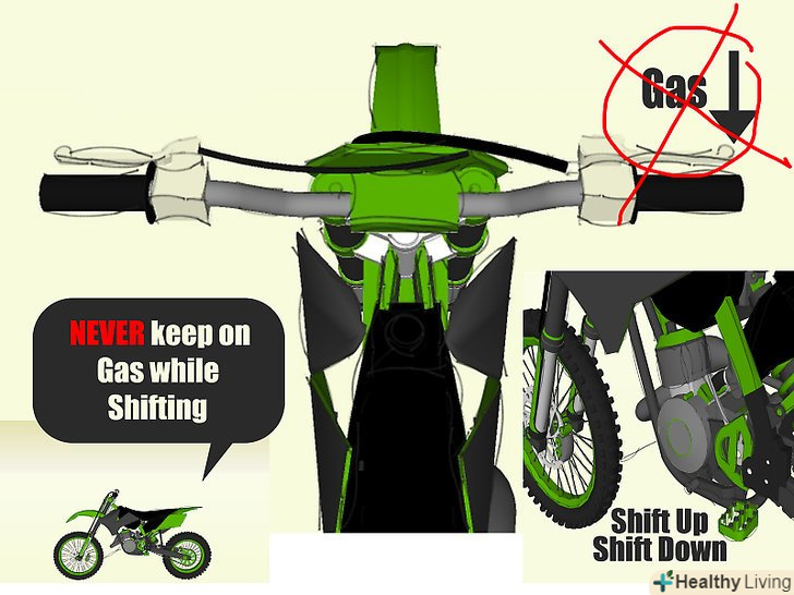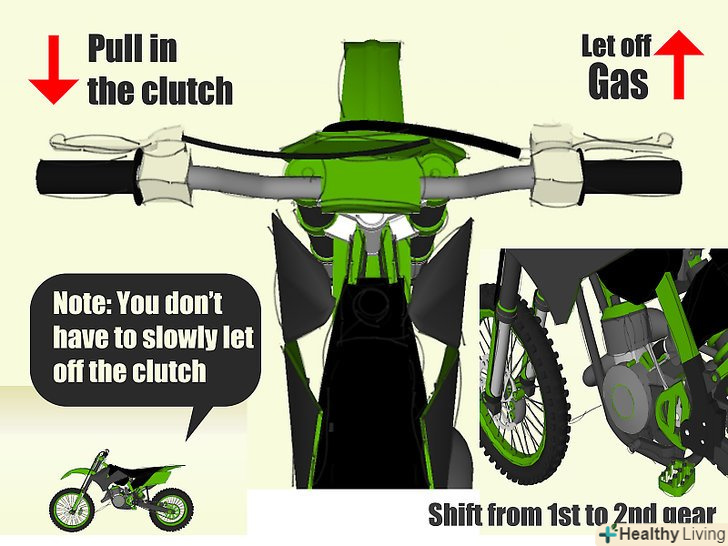 Перейдіть з першої передачі на другу. When the bike is not moving any faster and you can hear the engine revving at its highest, let off on the gas a bit, pull in the clutch, and kick the shifter up into second. Після перемикання передачі відпустіть зчеплення і додайте газу (Вам необов'язково робити це також повільно, як при старті). Також перемикайтеся і на більш високі передачі.