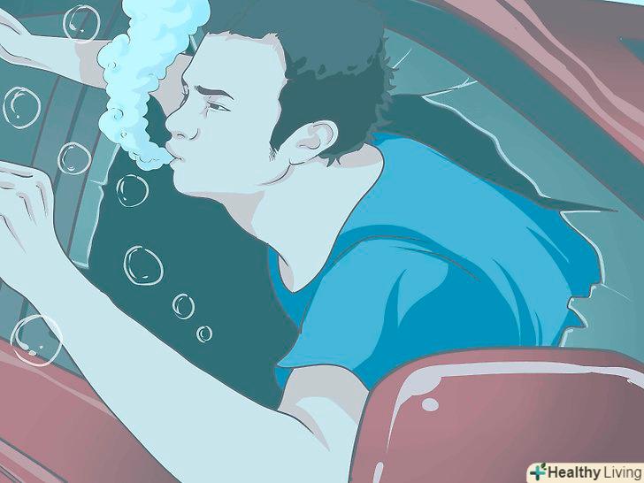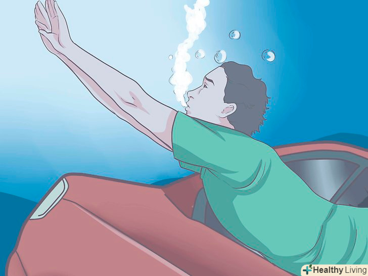 Вибирайтеся, коли машина заповниться водою.якщо справа дійшла вже до тієї стадії, коли салон повністю заповнений водою, для виживання вам доведеться діяти максимально чітко і швидко. Зазвичай для цього потрібно від 60 до 120 секунд.[22] поки в кабіні є повітря, повністю сконцентруйтеся на своїх діях і намагайтеся дихати глибоко і розмірено. Розблокуйте двері вручну або за допомогою автоматики. Якщо двері не відкриваються, вам буде потрібно попередньо подбати про те, як розбити вікно (див.попередній крок).- Продовжуйте спокійно дихати, поки вода не дійде до рівня грудей. Після цього зробіть глибокий вдих і затисніть ніс.
