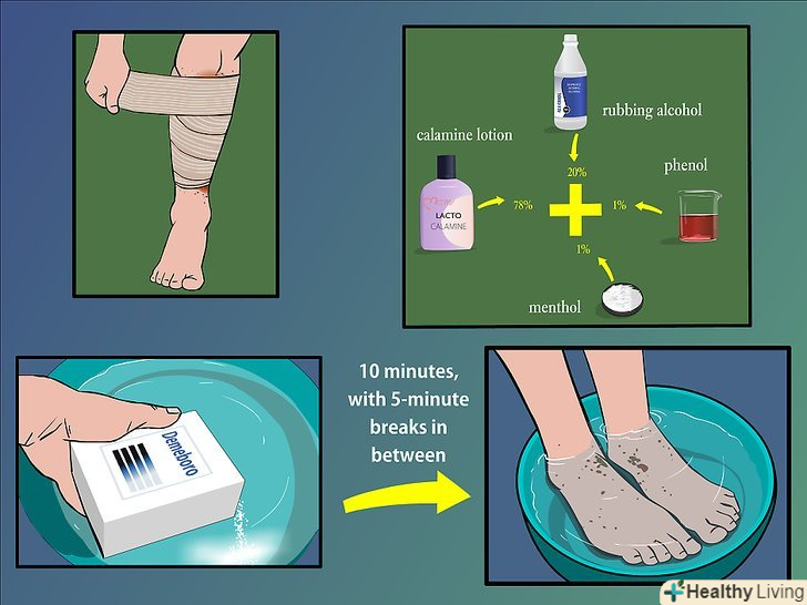 - Попросіть фармацевта змішати мазь. Попросіть свого фармацевта змішати 78 % лосьйону "каламін" з 20% медичного спирту, 1% фенолу і 1% ментолу.[3] Наносите цей засіб на бульбашки, поки не утвориться кірка.