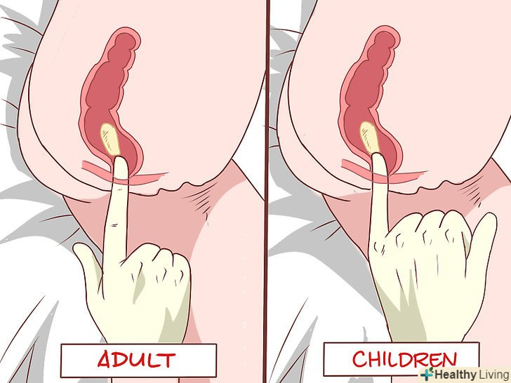 Введіть свічку.акуратно введіть свічку заокругленим кінцем в пряму кишку і проштовхніть її вказівним пальцем (дорослому) або мізинцем (дитині).- Дорослій людині необхідно проштовхнути свічку в пряму кишку на глибину не менше 2,5 см.