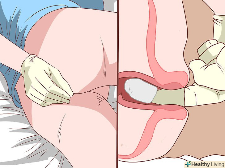 Введіть свічку в пряму кишку.підніміть праву (верхню) сідницю, відкривши пряму кишку-так свічку буде легше ввести. Вставте свічку поздовжньо, щоб вона легше увійшла.- Дорослій людині необхідно проштовхнути свічку в пряму кишку на глибину не менше 2,5 см.