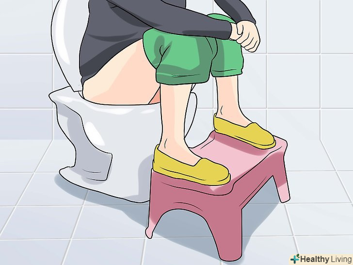 Змініть позу на унітазі.можна також спробувати по-іншому сидіти на унітазі. При цьому ставте ноги на низьку табуретку або іншу височину. Намагайтеся, щоб ваші коліна знаходилися якомога ближче до грудей. Тим самим ви збільшите тиск на кишечник і полегшите проходження стільця.[14]- Постарайтеся якомога повніше розслабитися і надати кишечнику можливість зробити свою справу.