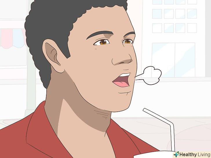 Спробуйте позбутися від неприємних відчуттів за допомогою відрижки.відрижка дозволяє випустити газ з протилежного боку. Хоча за допомогою відрижки не вдасться випустити газ, що накопичився в нижніх відділах кишечника, вона дозволить позбутися від газу в шлунку і верхніх відділах травної системи. У шлунку може накопичуватися повітря, який заковтується в результаті занадто швидкого прийому їжі або напоїв, пиття через соломинку, жування гумки або куріння. Відрижка дозволить легко і безболісно випустити накопичився в шлунку повітря.[3] щоб спровокувати відрижку, можна випити невелику кількість газованого напою. Однак потрібно пам'ятати, що надмірне вживання газованих напоїв сприяє здуттю живота і метеоризму.- Щоб простимулювати відрижку, можна скористатися натуральними засобами. Спробуйте імбир, м'яту, лимонний сік або папайю.