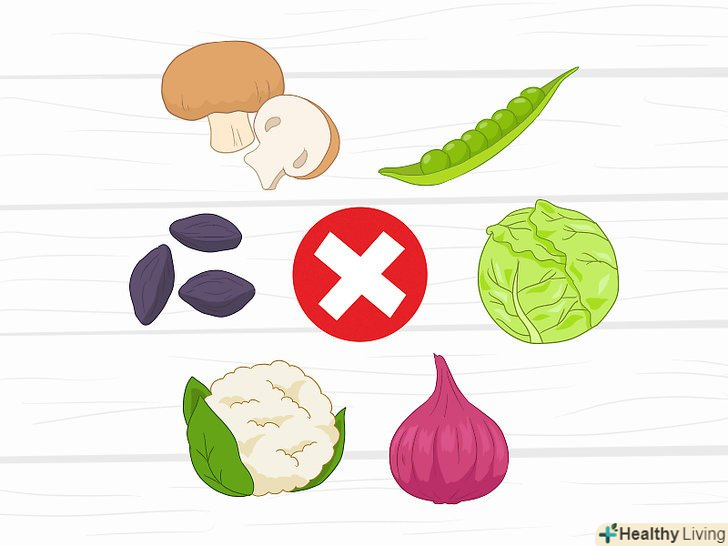 Намагайтеся не вживати продукти, що провокують утворення газу.деякі продукти сприяють утворенню кишкового газу, так як вони погано перетравлюються або в їх склад входять речовини, дратівливі шлунок і кишечник. До продуктів, що викликають метеоризм, відносяться Квасоля, горох, сочевиця, капуста, цибуля, брокколі, цвітна капуста, чорнослив і гриби.[4] причиною метеоризму, здуття живота і діареї може стати вживання великої кількості нерозчинної клітковини (міститься практично у всіх овочах і шкірці деяких фруктів), фруктози (міститься у всіх фруктах, особливо солодких ягодах) і глютену (міститься в злаках, таких як пшениця, ячмінь і жито). Сирі овочі і фрукти потрібно їсти потроху, ретельно їх пережовувати і вичікувати достатньо часу до наступного прийому їжі, щоб вони встигли повністю перетравитися.- Глютенова ентеропатія (целіакія) — це захворювання, при якому погано засвоюється глютен. В результаті він дратує кишечник, провокує появу метеоризму і хворобливих відчуттів в животі.