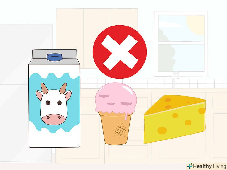 Якщо у вас непереносимість лактози, то намагайтеся не вживати молочні продукти.непереносимість лактози буває через те, що в організмі виробляється недостатня кількість (або взагалі не виробляється) ферменту лактаза, за допомогою якого розщеплюється і перетравлюється молочний цукор (лактоза). Неперетравлена лактоза потрапляє в товстий кишечник, де стає субстратом для» хороших " бактерій. Бактерії використовують її в якості їжі, здійснюючи процес бродіння, в результаті якого і утворюється газ як побічний продукт. Симптомами непереносимості лактози є метеоризм, здуття живота, спазми в животі і діарея.[5] якщо ви припускаєте, що у вас є непереносимість лактози, то виключіть зі свого раціону молочні продукти, особливо коров'яче молоко, сир, вершки, морозиво і молочні коктейлі.- У міру дорослішання в організмі виробляється все менше і менше лактази. Це означає, що збільшується ймовірність розвитку непереносимості лактози.[6]