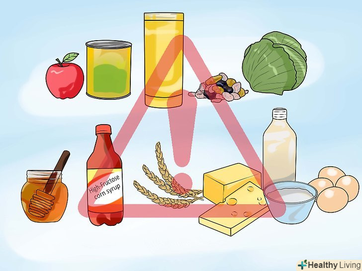 Дотримуйтесь дієти з низьким вмістом речовин групи FODMAP.[5] англомовний акронім FODMAP позначає ферментовані олігосахариди, дисахариди, моносахариди і поліоли (багатоатомні спирти). Дані речовини провокують симптоми СРК, тому для поліпшення стану рекомендується менше вживати багату ними їжу.[6] велика кількість цих речовин міститься в наступних продуктах:- Деякі фрукти, такі як яблука, ожина, абрикоси, вишні, нектарин, манго, персики, кавун, сливи
