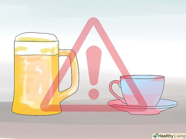 Знизьте вживання алкоголю і кофеїну. Алкоголь і кофеїн можуть дратувати травну систему, викликати біль у животі, діарею або запор. Постарайтеся знизити кількість алкоголю і кофеїну в своєму раціоні або повністю відмовтеся від них і подивіться, чи покращиться ваш стан.[10]- Наприклад, замість двох чашок кави вранці випивайте лише одну, або замість келиха мартіні за вечерею обмежтеся склянкою води.