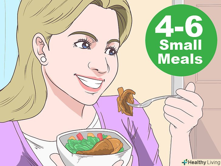 Їжте невеликими порціями 4-6 разів протягом дня.приймайте їжу через кожні 3-4 години, щоб забезпечити організм необхідною йому енергією. Постарайтеся при кожному прийомі їжі вживати білкові продукти, наприклад курятину, щоб довше залишатися ситим. Це прекрасний спосіб уникнути великих порцій, які можуть викликати здуття живота, нетравлення шлунка і відрижку.[9]- Прикладом невеликої порції здорової їжі є яєчня-базіка з пшеничним тостом.