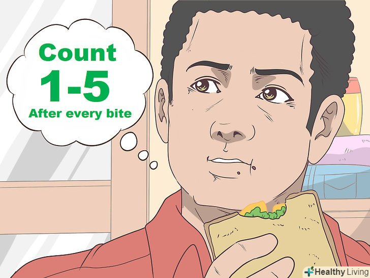 Рахуйте від 5 до 1 кожен раз, коли кладете в рот черговий шматок їжі або робите ковток.поспішна їжа або питво призводять до того, що в травний тракт потрапляє зайве повітря, який викликає відрижку. Їжте повільніше-робіть паузи і вважайте про себе після того, як покладіть в рот черговий шматок. Це дозволить вам розслабитися під час їжі, і в ваш травний тракт потрапить менше повітря.[2]