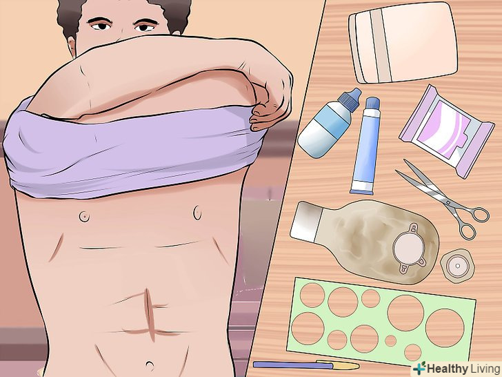 Підготуйте все необхідне і зніміть сорочку.перш ніж приступити до заміни калоприймача, складіть витратні матеріали в одному місці так, щоб вам легко було все діставати. Сорочка буде заважати міняти калоприймач, тому зніміть її.[10] вам знадобляться:- Новий мішок;