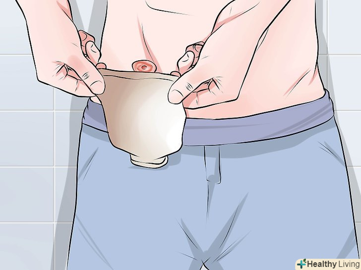 Вимийте стому.використовуючи серветки, вимийте стому і шкіру навколо неї теплою водою з м'яким милом. Терти стому не можна! Можна тільки акуратно протирати її.[5] мило не повинно містити масла або ароматизатори. Просушіть шкіру, промокнувши її сухою серветкою.- Якщо необхідно, використовуйте пристрій для вимірювання стоми, який дав вам лікуючий лікар або медсестра. Для того щоб прикріпити новий калоприймач, необхідно знати точний розмір стоми, тому спочатку виміряйте її.[6]