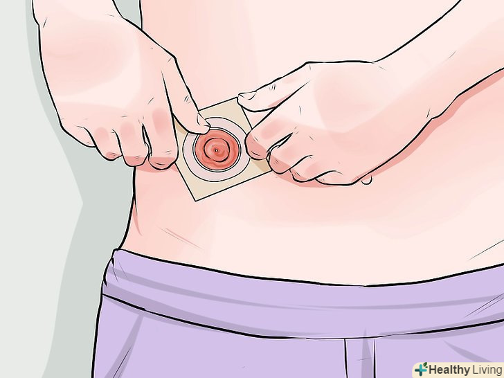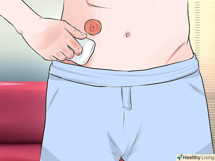 Розмістіть фланець на стомі.спочатку притисніть нижню частину фланця під стомою, потім обережно просувайтеся в сторони і вгору. Приклеївши фланець, розгладьте всі утворилися складки. Завдяки цьому фланець буде щільніше прилягати навколо стоми.[8]- Починайте розгладжувати складки в центрі близько стоми, а потім просувайтеся до зовнішніх країв. Важливо розгладити всі складки, інакше калоприймач може протекти.