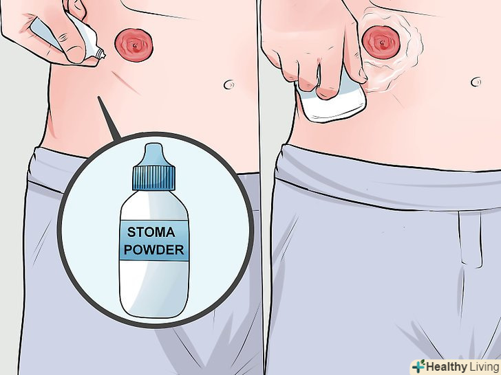 Можете використовувати спеціально призначену для стоми присипку, щоб створити на шкірі захисний бар'єр.хоча це і необов'язково, багато хто використовує присипку не тільки щоб захистити шкіру, але щоб створити ідеальну основу для кріплення нового калоприймача. Присипте шкіру навколо стоми невеликою кількістю порошку. Присипка не повинна потрапляти на стому. Обережно протріть її сухою серветкою і почекайте 60 секунд, поки вона остаточно просохне.