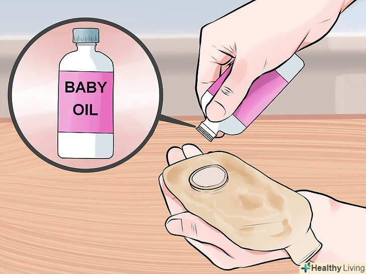 Налийте в калоприймач дитяче масло.обережно налийте кілька крапель дитячого масла в мішок. Робіть це обережно, щоб масло не потрапило ні на що інше.- За допомогою дитячого масла вам буде легше спорожнити калоприймач, так як воно не дозволить калу прилипати до стінок мішка.