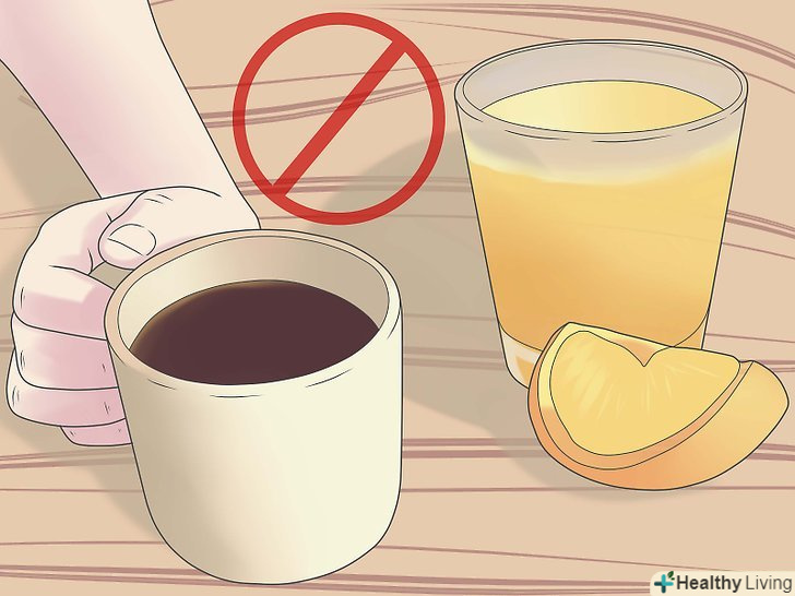 Утримуйтеся від кави і апельсинового соку.прийом кави робить людину енергійною завдяки вмісту в ньому кофеїну. Але кофеїн також стимулює виробництво шлункової кислоти, а підвищена кислотність збільшує ймовірність проходження вмісту шлунка в зворотному порядку. Аналогічно, потрібно утримуватися від усього, що підвищує кислотність (наприклад, апельсинового соку).- Сік з апельсинів та інших цитрусових містить багато вітаміну C (або аскорбінової кислоти). Аскорбінова кислота підвищує кислотність шлунка, збільшуючи ймовірність кислотного рефлюксу.