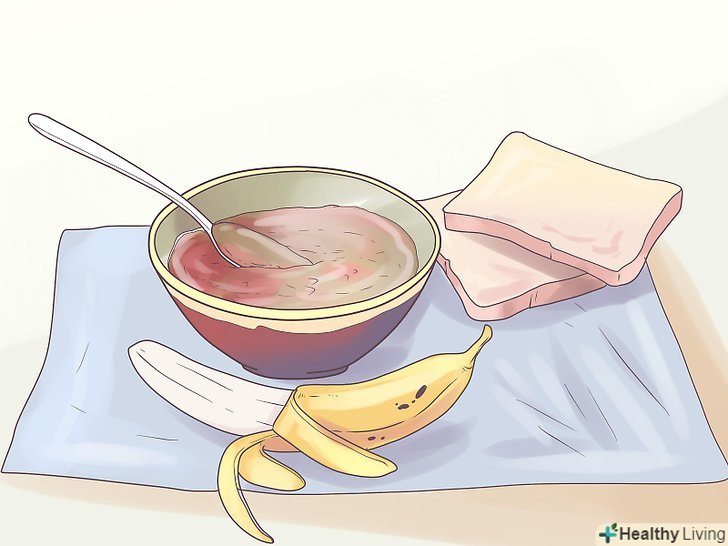 Спробуйте brat дієту. BRAT розшифровується як банани, рис, яблучне пюре і тости. Ви можете додавати і інші несмачні продукти в цю дієту, наприклад, солоні крекери, відварну картоплю або бульйони. Не починайте відразу їсти молочні, солодкі або жирні продукти, так як вони можуть погіршити нудоту.[2]- Ця дієта не дуже підходить дітям. Так як продукти в BRAT дієті виділяються низьким вмістом клітковини, білка і жиру, такого харчування не достатньо для відновлення шлунково-кишкового тракту дитини. Американська академія педіатрії рекомендує дітям відновлювати нормальне, збалансоване харчування, відповідне за віком, протягом 24 годин з моменту захворювання. Дитячий раціон повинен включати в себе поєднання фруктів, овочів, м'яса, йогурту і складних вуглеводів.[3]